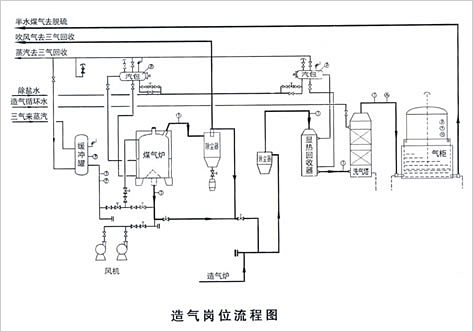 三、煤氣發(fā)生爐按工藝特性以四臺爐為一套制氣系統(tǒng),單系統(tǒng)吹風(fēng)氣設(shè)置一臺總管除塵器,煤氣設(shè)置一臺總管除塵器和“一器一塔”(顯熱回收與洗氣塔)。同時設(shè)置一套吹風(fēng)氣回收裝置。
